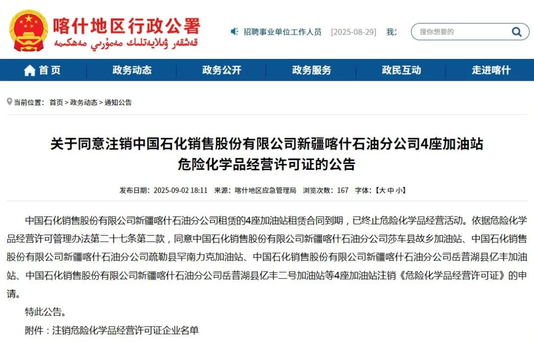 近期,中国石化旗下注销《危险化学品经营许可证》的4座加油站分别是莎车县故乡加油站、疏勒县罕南力克加油站、岳普湖县亿丰加油站及岳普湖县亿丰二号加油站。